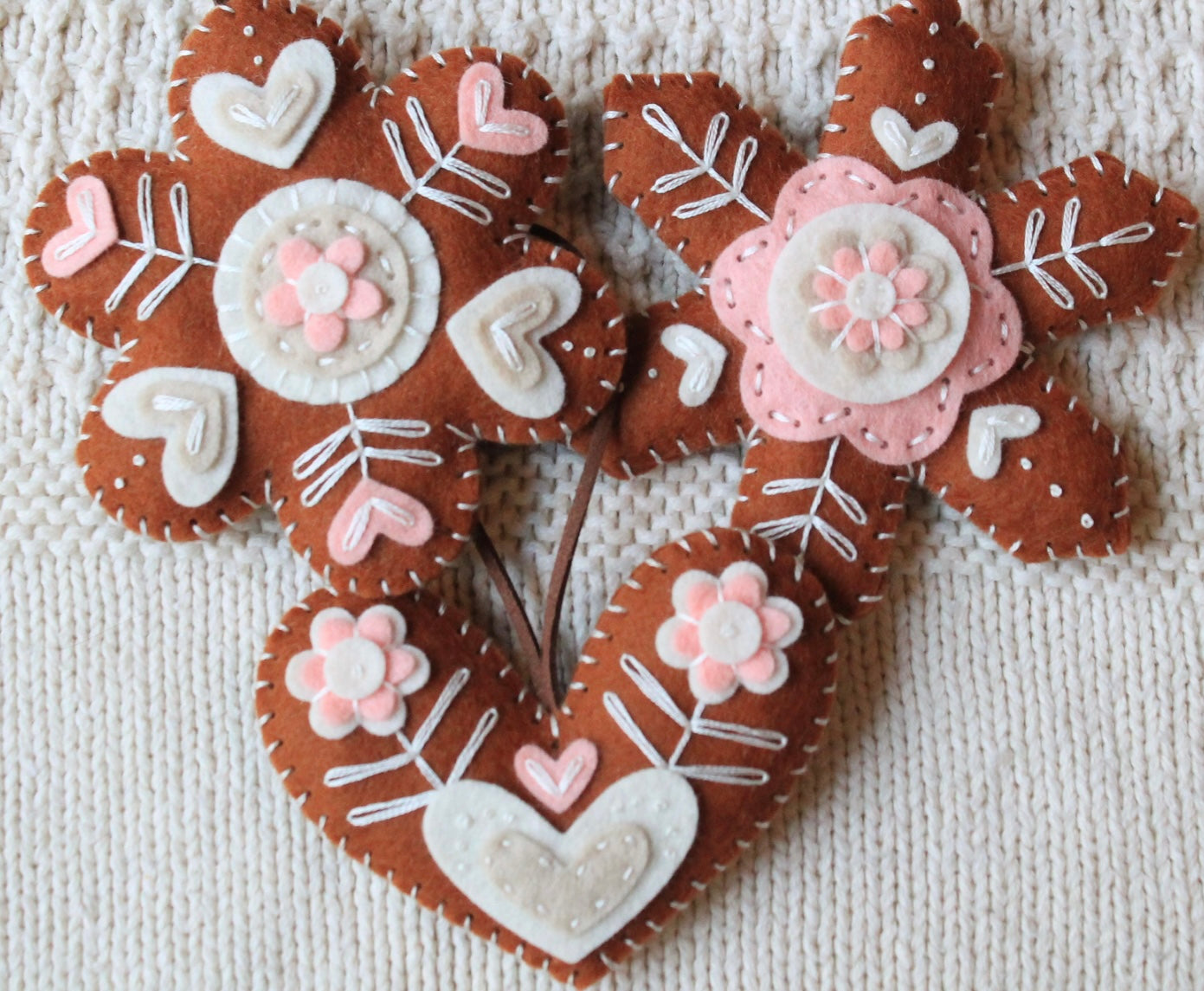All felt is pure wool from Benzie Design, all pieces are cut out with a die cutter. Ornaments all measure about 4" wide.